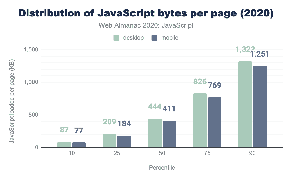 The median site (the 50th percentile) sends 444 KB of JavaScript when loaded on a desktop device, and slightly fewer (411 KB) to a mobile device.