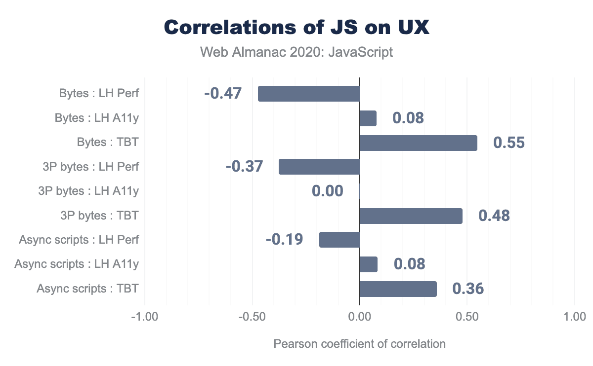 The correlation between JavaScript bytes and Lighthouse performance scores is -0.47. In other words, as JS bytes increase, Lighthouse performance scores decrease. The overall bytes has a stronger correlation than the amount of third-party bytes (“3P bytes”), hinting that while they certainly play a role, we can’t place all the blame on third-parties.