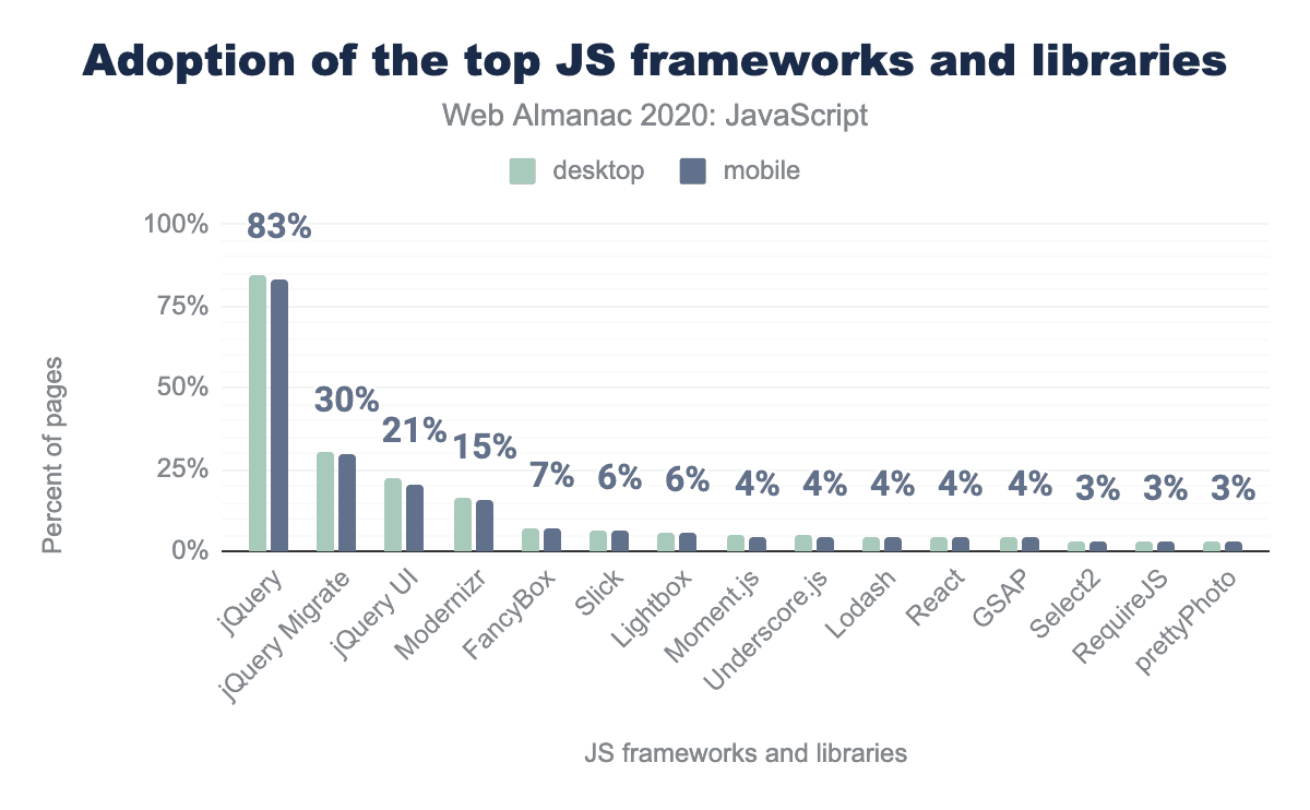 As we’ve increasingly used more JavaScript to power our sites and applications, there has also been an increasing demand for open-source libraries and frameworks to help with improving developer productivity and overall code maintainability. Sites that don’t wield one of these tools are definitely the minority on today’s web—jQuery alone is found on nearly 85% of the mobile pages tracked by HTTP Archive.