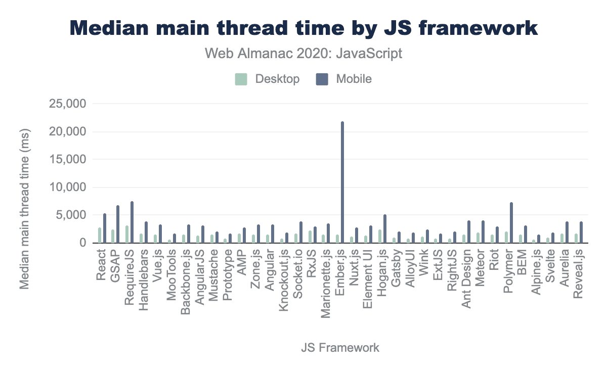 Tools like React, GSAP, and RequireJS tend to spend a lot of time on the main thread of the browser, regardless of whether it’s a desktop or mobile page view. The same tools that tend to lead to less code overall—tools like Alpine and Svelte—also tend to lead to lower impact on the main thread.