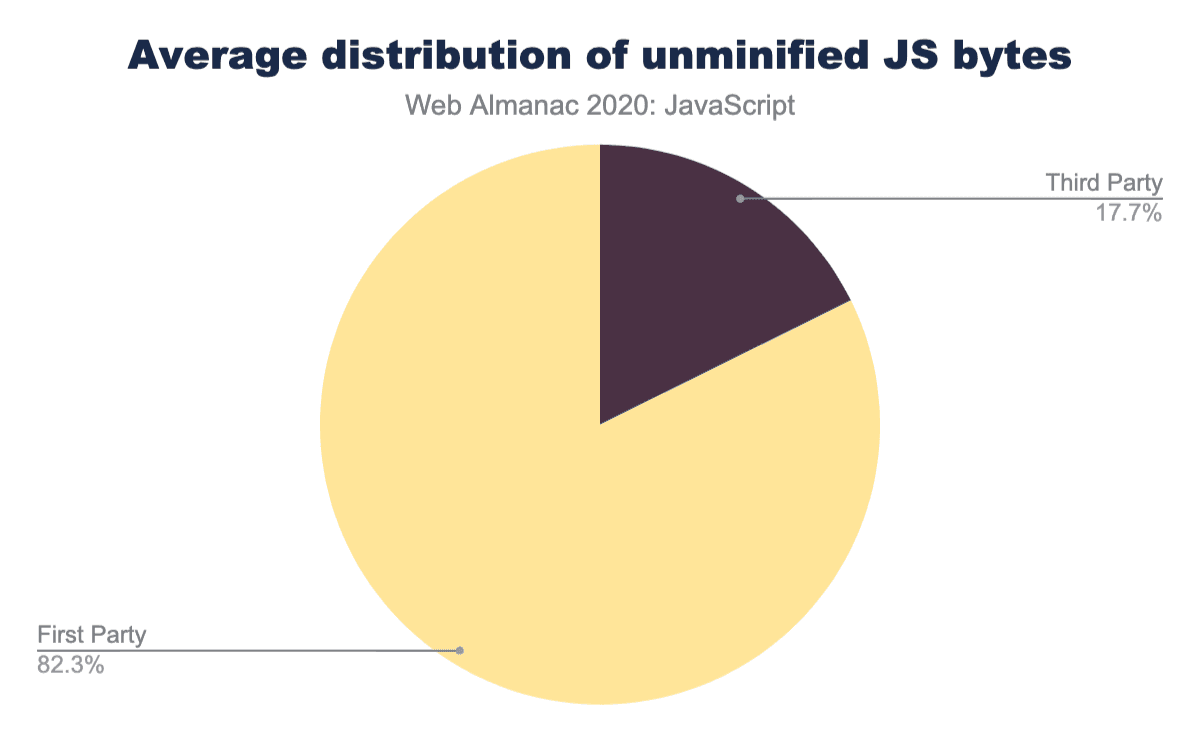 Interestingly, while we’ve picked on third-party requests a bit, this is one area where third-party scripts are doing better than first-party scripts. 82% of the average mobile page’s unminified JavaScript bytes come from first-party code.