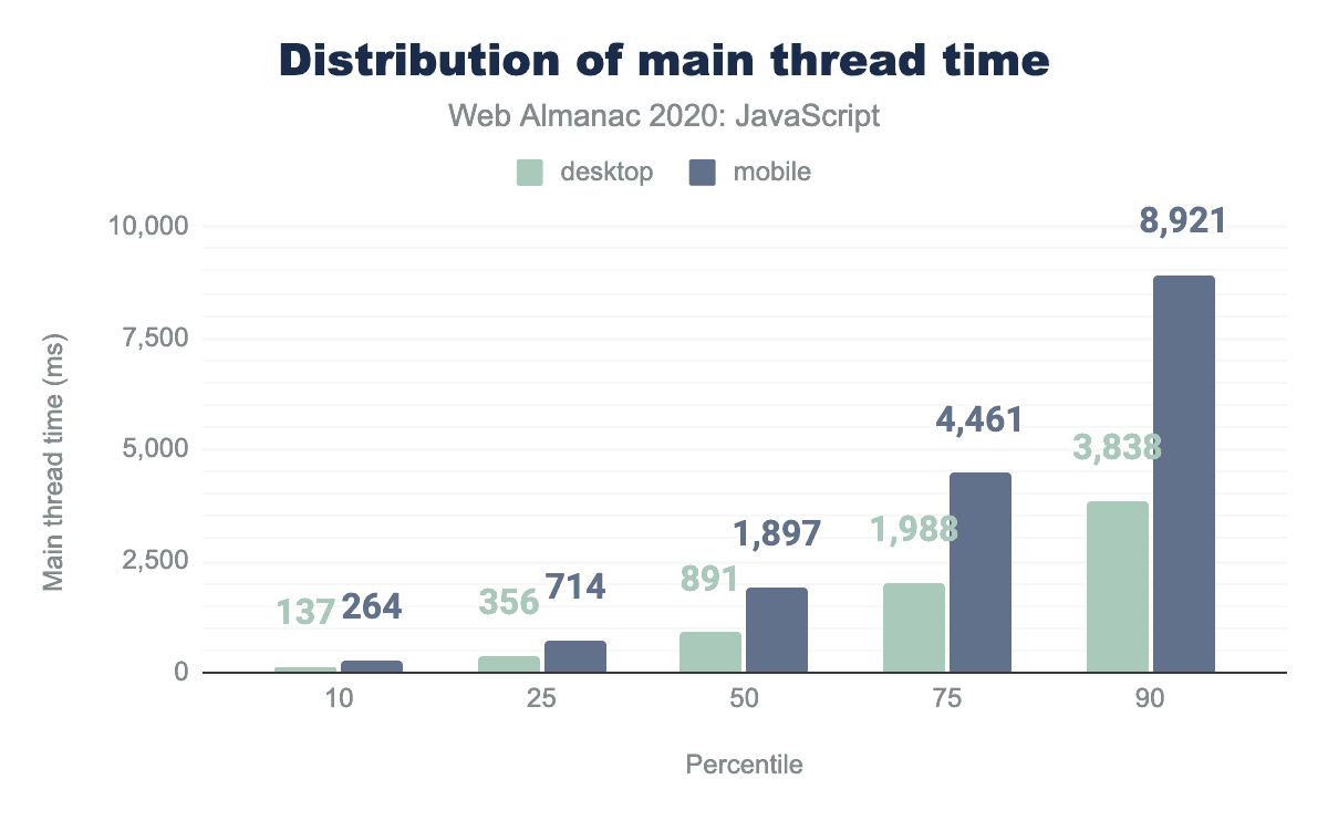 The median desktop site spends 891 ms on the main thread of a browser working with all that JavaScript. The median mobile site, however, spends 1,897 ms—over two times the time spent on the desktop. It’s even worse for the long tail of sites. At the 90th percentile, mobile sites spend a staggering 8,921 ms of main thread time dealing with JavaScript, compared to 3,838 ms for desktop sites.