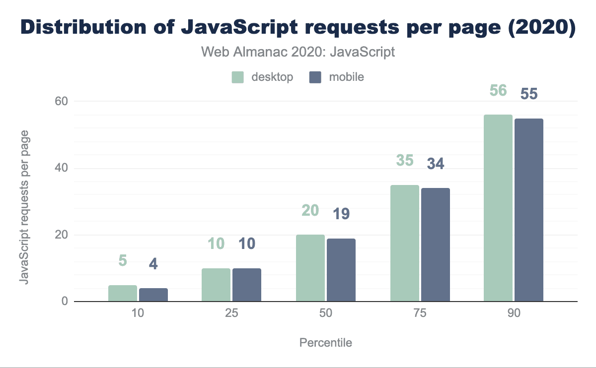 Another way of looking at how much JavaScript we use is to explore how many JavaScript requests are made on each page. While reducing the number of requests was paramount to maintaining good performance with HTTP/1.1, with HTTP/2 the opposite is the case: breaking JavaScript down into smaller, individual files is typically better for performance.