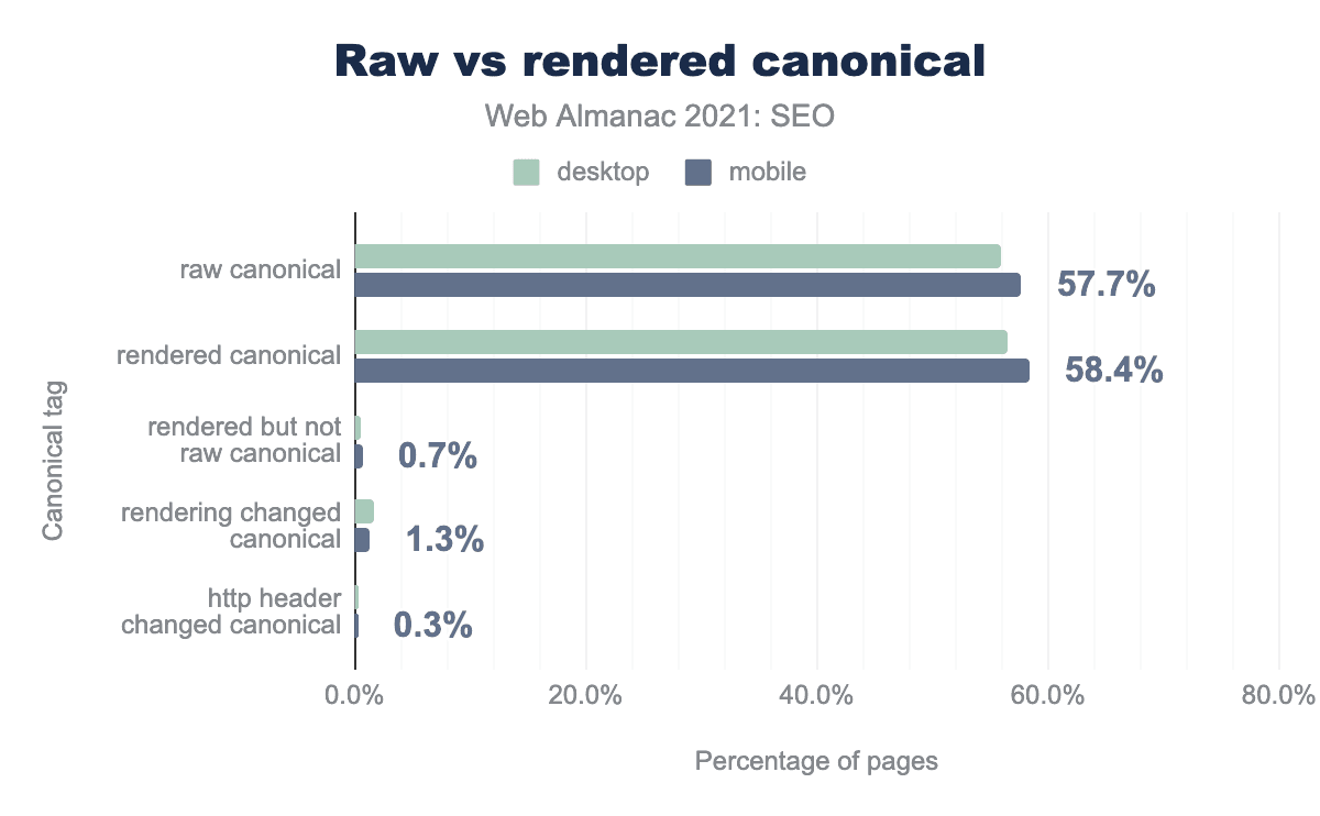 The data shows increased adoption of canonical tags over the years. For example, 2019’s edition shows that 48.3% of mobile pages were using a canonical tag. In 2020’s edition, the percentage grew to 53.6%, and in 2021 we see 58.5%.