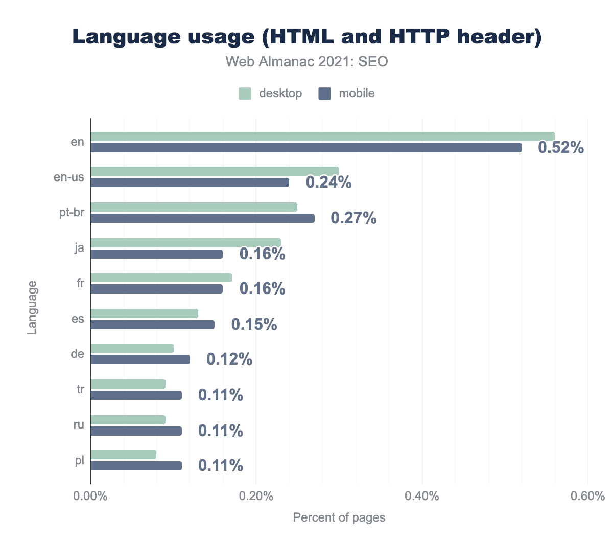 Using the HTML tag is less popular, with content-language appearing on just 3.3% of mobile websites.