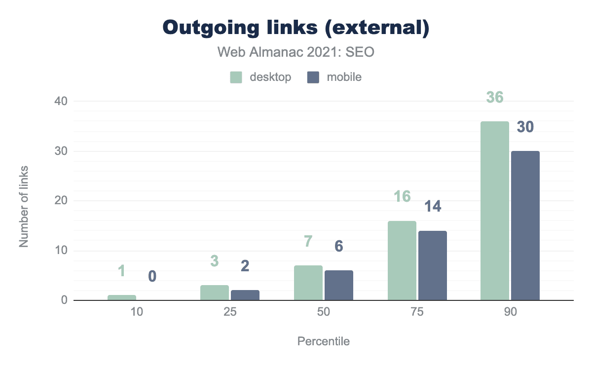 The data shows that the median number of internal links on desktop is 16% higher than mobile, 64 vs 55 respectively. It’s likely this is because developers tend to minimize the navigation menus and footers on mobile to make them easier to use on smaller screens.