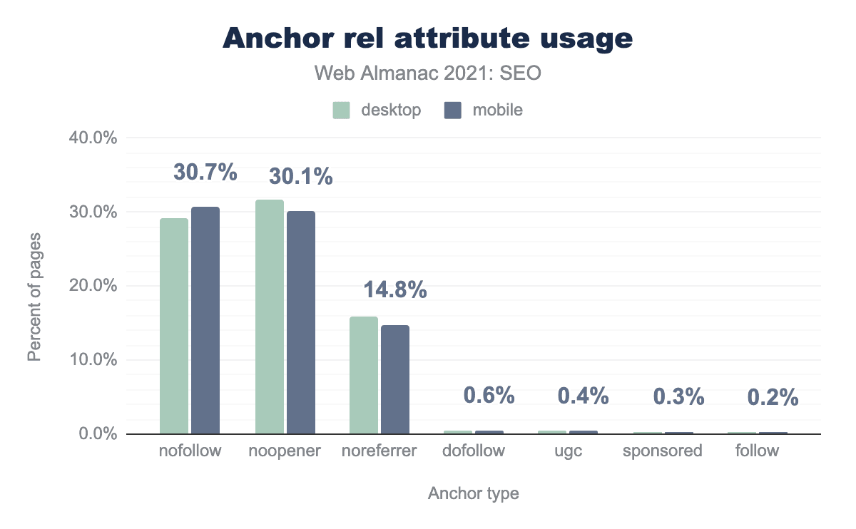 rel="nofollow" was found on 30.7% of mobile pages, similar to last year. With the attribute used so much, it’s no surprise that Google has changed nofollow to a hint—which means they can choose whether or not they respect it.