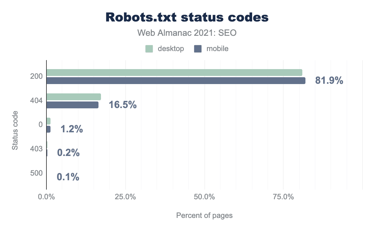 81.9% of websites make use of the robots.txt file (mobile). Compared with previous years (72.2% in 2019 and 80.5% in 2020), that’s a slight improvement.