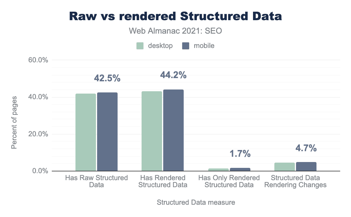 42.5% of mobile pages and 41.8% of desktop pages have structured data in the HTML. JavaScript modifies the structured data on 4.7% of mobile pages and 4.5% of desktop pages.
