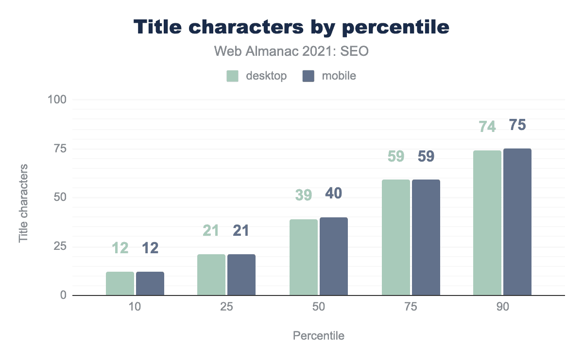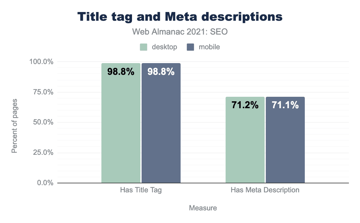 In 2021, 98.8% of desktop and mobile pages had <title> elements. 71.1% of desktop and mobile home pages had <meta name="description"> tags.