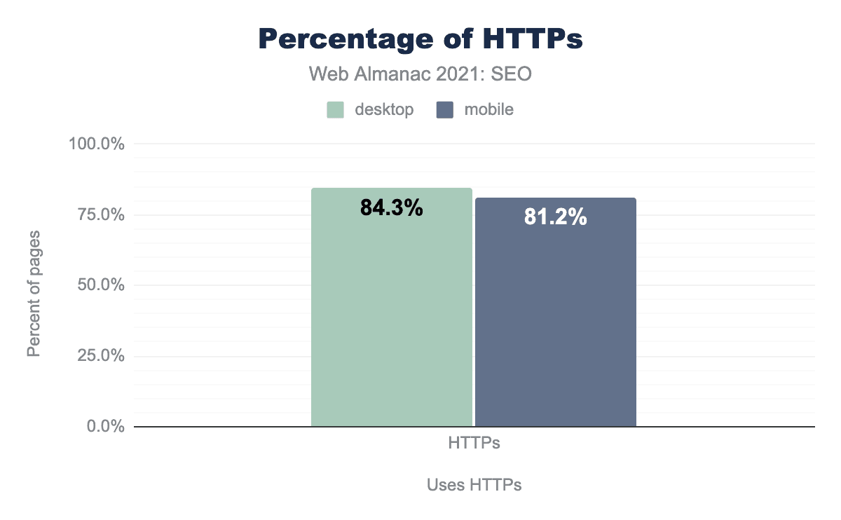 Adoption of HTTPS is still increasing. HTTPS was the default on 81.2% of mobile pages and 84.3% of desktop pages. That’s up nearly 8% on mobile websites and 7% on Desktop websites year over year.