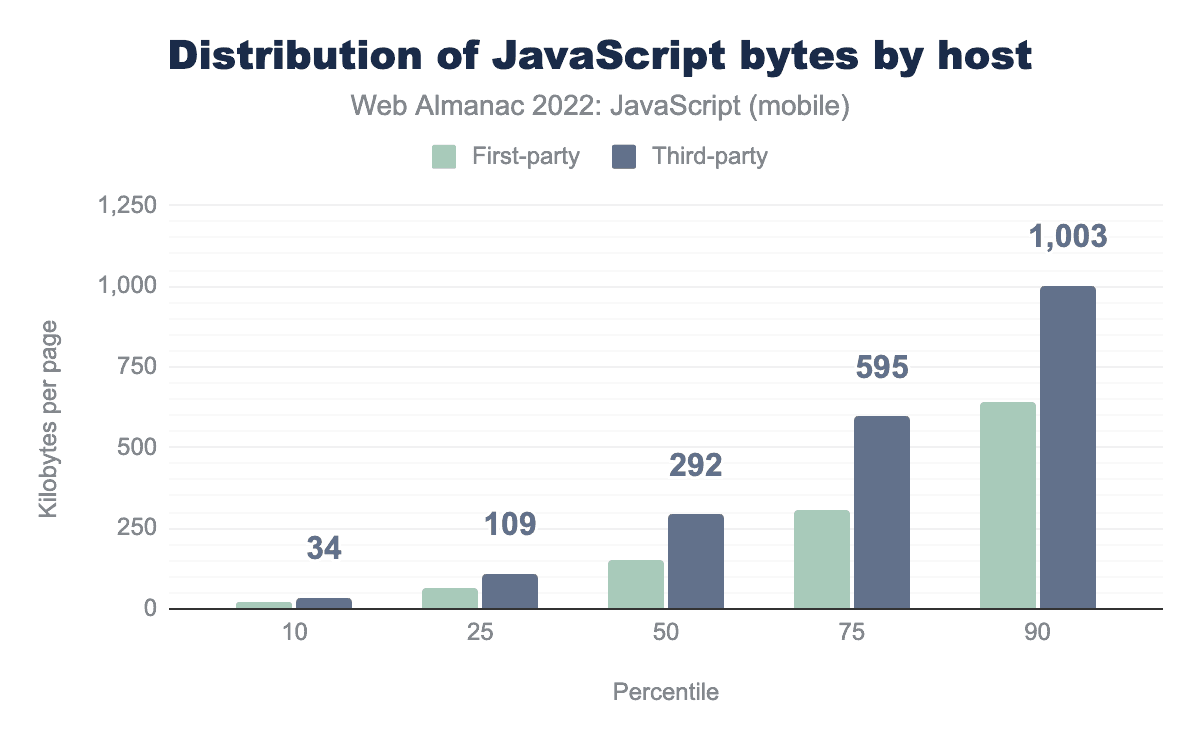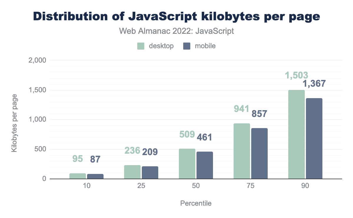 As was the case last year, this year marks yet another increase in the amount of JavaScript shipped to browsers. From 2021 to 2022, an increase of 8% for mobile devices was observed, whereas desktop devices saw an increase of 10%. While this increase is less steep than in previous years, it’s nonetheless the continuation of a concerning trend. While device capabilities continue to improve, not every one is running the latest device. The fact remains that more JavaScript equates to more strain on a device’s resources.
