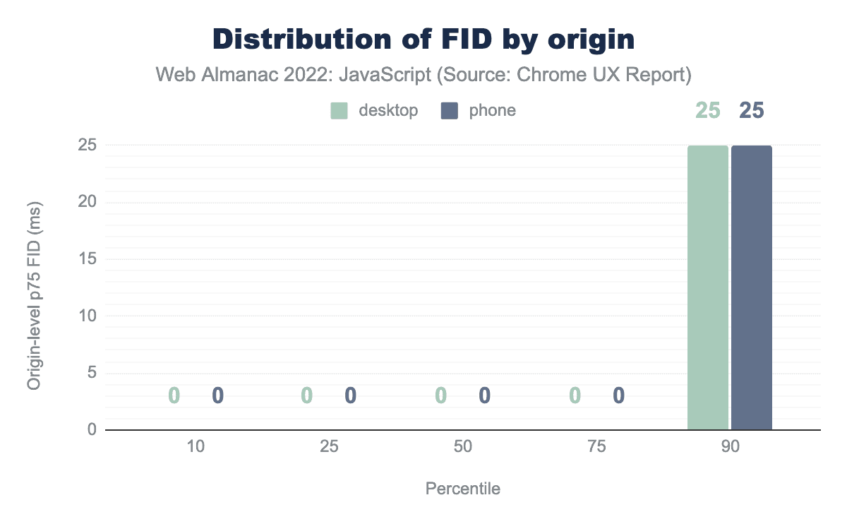 This chart shows the distribution of all websites’ 75th percentile FID values. The median website has a FID value of 0 ms for at least 75% of both desktop and phone user experiences. This “perfect FID” experience even extends into the 75th percentile of websites. Only when we get to the 90th percentile do we start to see imperfect FID values, but only 25 ms.