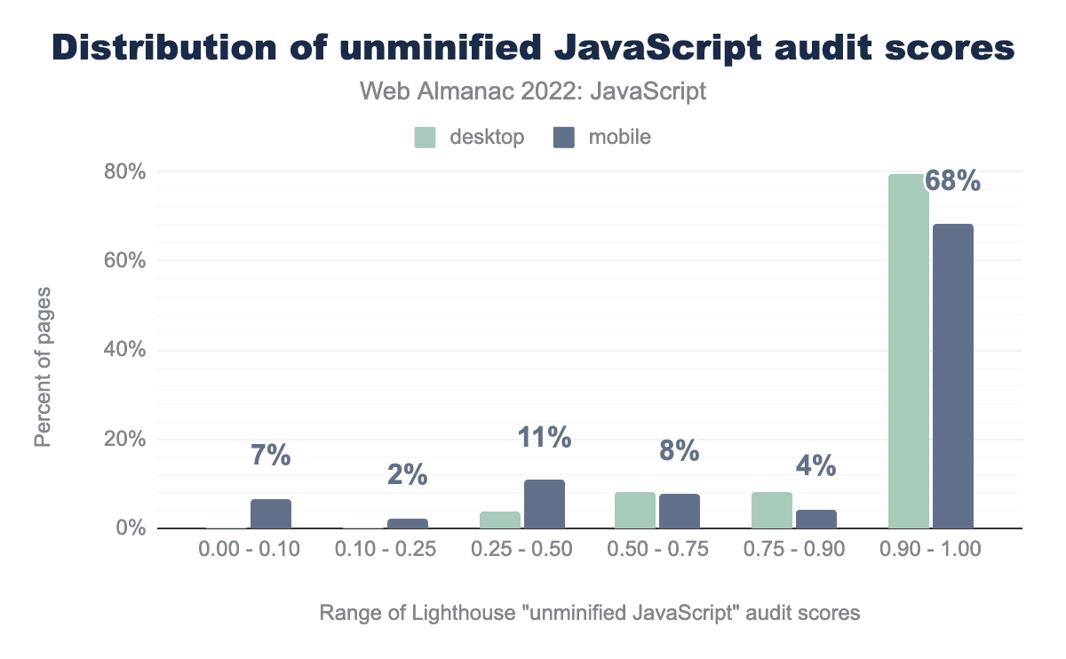 Since the advent of JavaScript runtimes such as Node.js, it has become increasingly common to rely on build tools in order to bundle and transform JavaScript. These tools, while undeniably useful, can have effects on how much JavaScript is shipped. New to the Web Almanac this year, we’re presenting data on the usage of bundlers and transpilers.