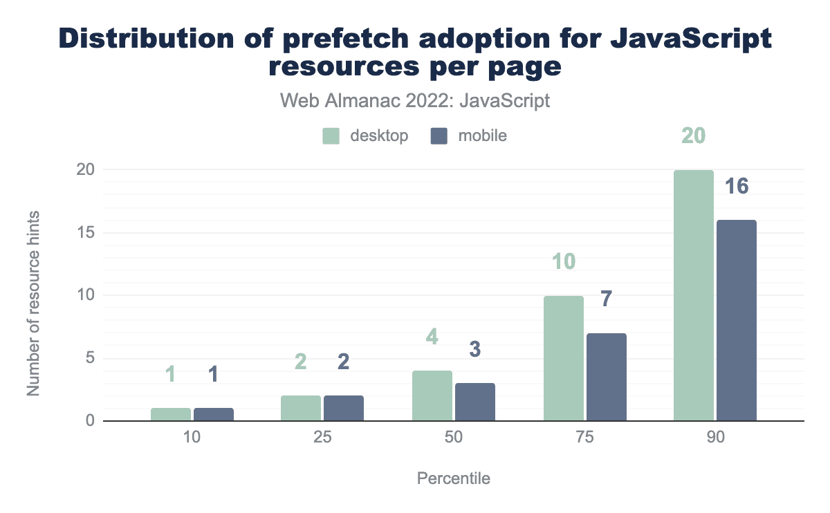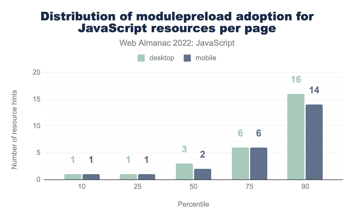 Unfortunately, we see five preload hints for JavaScript resources at the 90th percentile, which may be too much. This suggests that pages at the 90th percentile are especially reliant on JavaScript, and are using preload to try and overcome the performance issues that result.