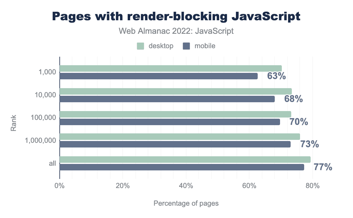 We found that 77% of mobile pages have at least one render-blocking script in the document <head>, whereas 79% of desktop pages do this. This is a concerning trend, because when scripts block rendering, page content is not painted as quickly as it could be.