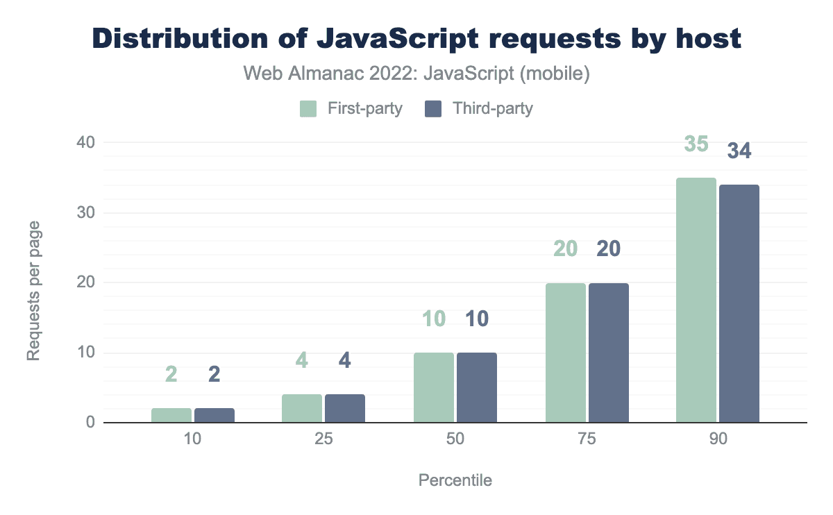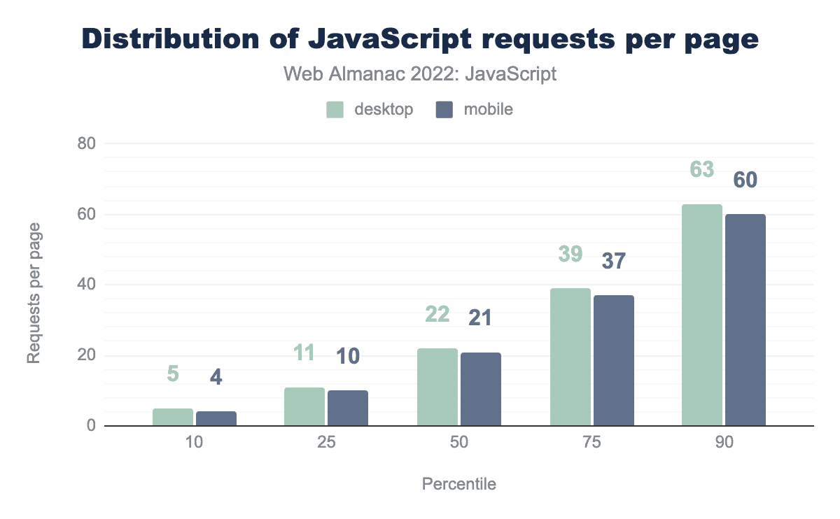 In 2022, the median mobile page responded to 21 JavaScript requests, whereas at the 90th percentile, there were 60. Compared to last year, this is an increase of 1 request at the median and 4 requests at the 90th percentile.