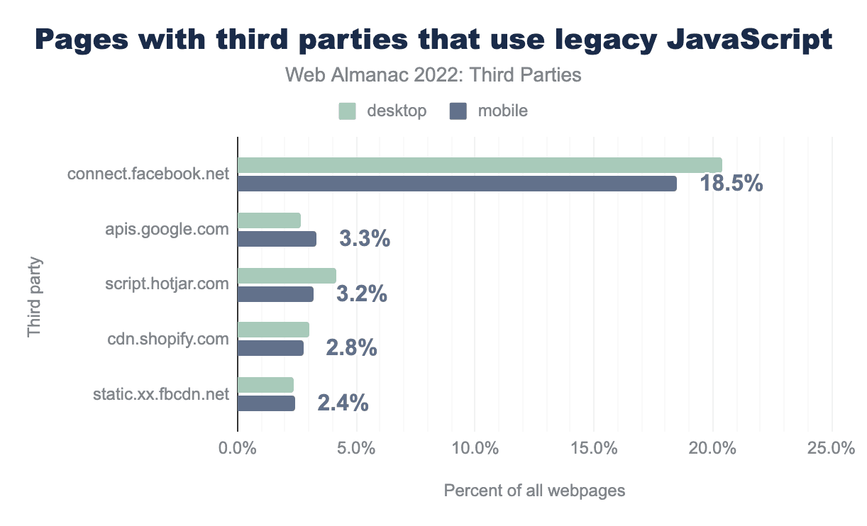 Facebook is a third-party with legacy JavaScript that affects the most pages. It introduces legacy code to around 20% of the total number of web pages on mobile and desktop devices correspondingly when looking at both facebook.net and fbcdn.net from the above graph. Nowadays, when old browsers like Internet Explorer may no longer need to be supported, the necessity to keep legacy JavaScript becomes lower. Despite this fact, the trends of using Facebook resources that have legacy JavaScript in the past 3 years reveal that the numbers actually increased—from around 14% in 2020 to 18% in 2022 for facebook.net alone. This is due to the increasing number of websites that embed this third party.