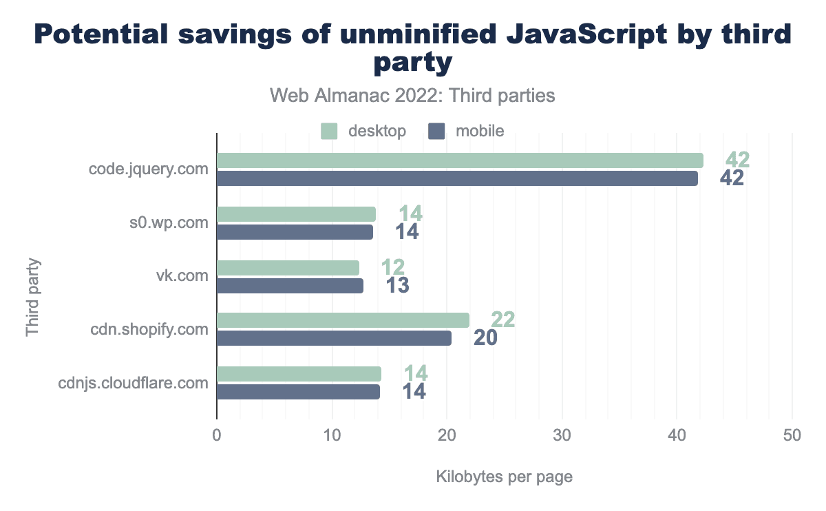 17% of the websites that use jQuery hosted on a third-party domain fail the Lighthouse audit for unminified JavaScript. Digging deeper into how the library is imported shows that many websites are using the unminified versions of jQuery that should only be used for development purposes. A similar tendency can be found in the usage of some other less popular third-party scripts.