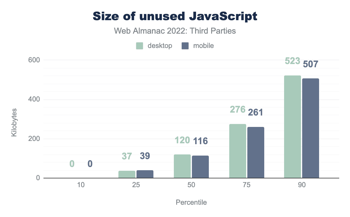 The median amount of unused third-party JavaScript is approximately 120 KB. For 25% of websites that use third-party scripts, it is more than 261 KB.