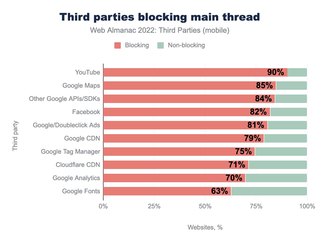 The figure above presents the top 10 most-used third parties and their impact on the main thread on mobile devices. Note that for desktop devices the impact is much lower. For example, YouTube blocks the main thread for 90% of the mobile websites while blocking only 26% of desktop websites it is embedded on. This is logical taking into account that desktop devices are much more powerful. However, nowadays mobile user experience is very important and—according to the Mobile Web chapter—58% of website visits are coming from mobile devices.