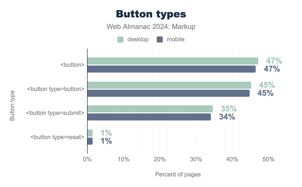 • 44.7% of mobile pages use <button type="button">, which is typically employed for actions not associated with form submissions (e.g., triggering JavaScript functions).