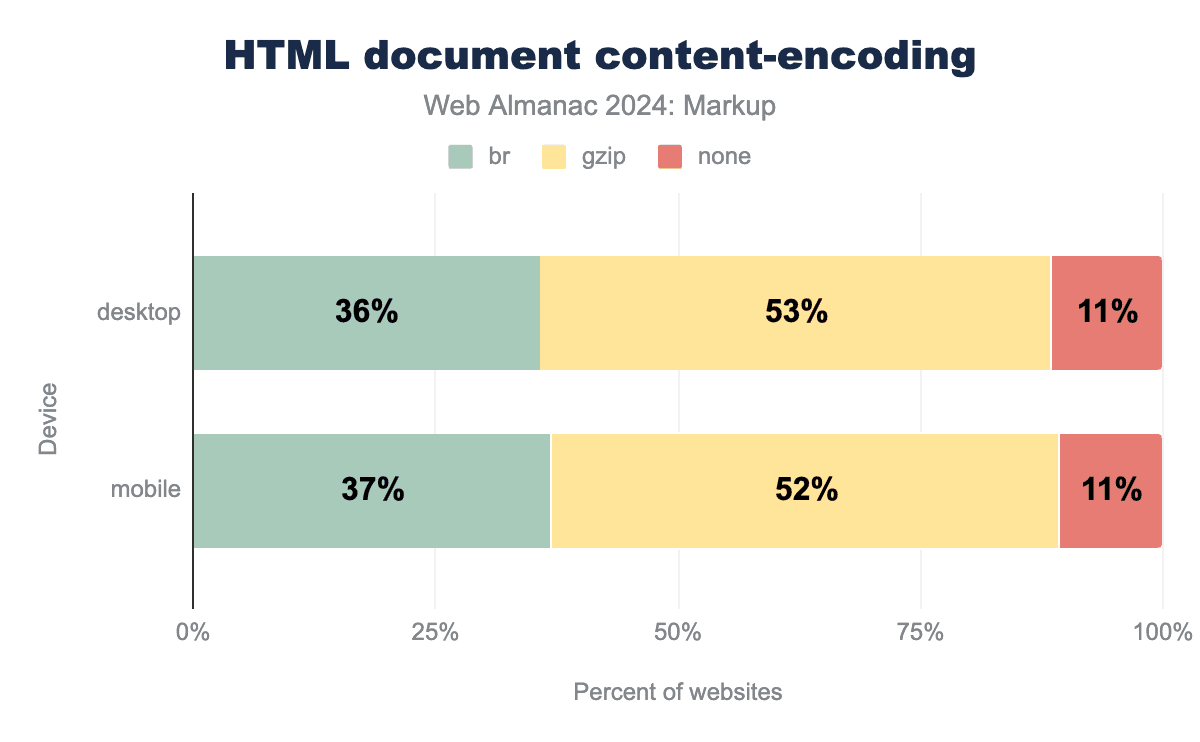 Despite these improvements, a small percentage of HTML files (10.5% on mobile) are still served without any compression, presenting missed opportunities for optimization.