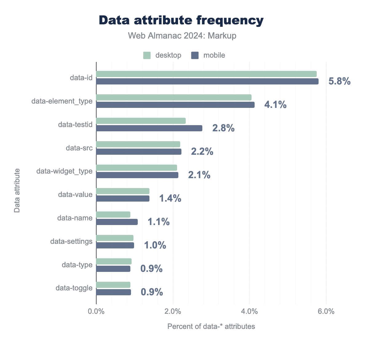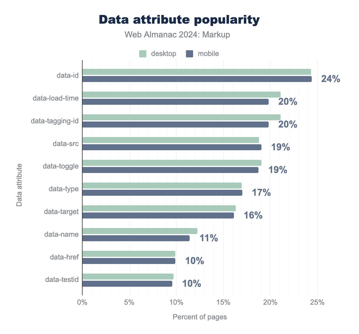 Another notable change is the appearance of new elements in the list: data-load-time and data-tagging-id appear on 20% of pages in 2024, occupying the second and third position of the ranking. These attributes were not part of the data-* attributes identified in 2022, indicating that performance tracking and tagging have become more important in modern web development.