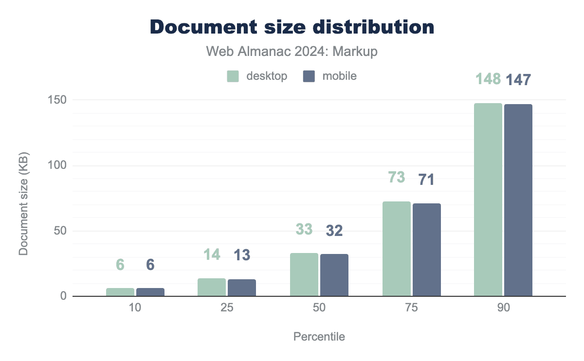 The percentile distribution reveals that at the 10th percentile, HTML files are as small as 6 KB, while at the 90th percentile, they reach up to 147 KB. These extremes highlight a significant variation in how developers structure their pages.