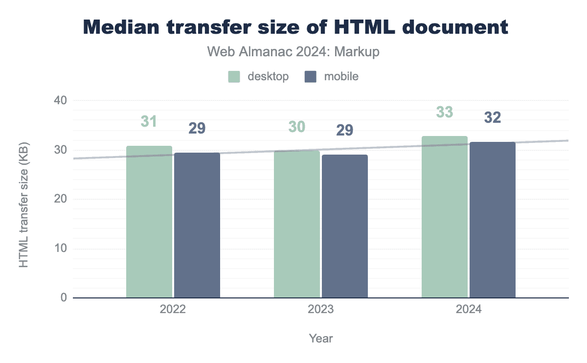 After a slight decrease in 2023, the HTML transfer size increased this year compared to 2022 and 2023.
