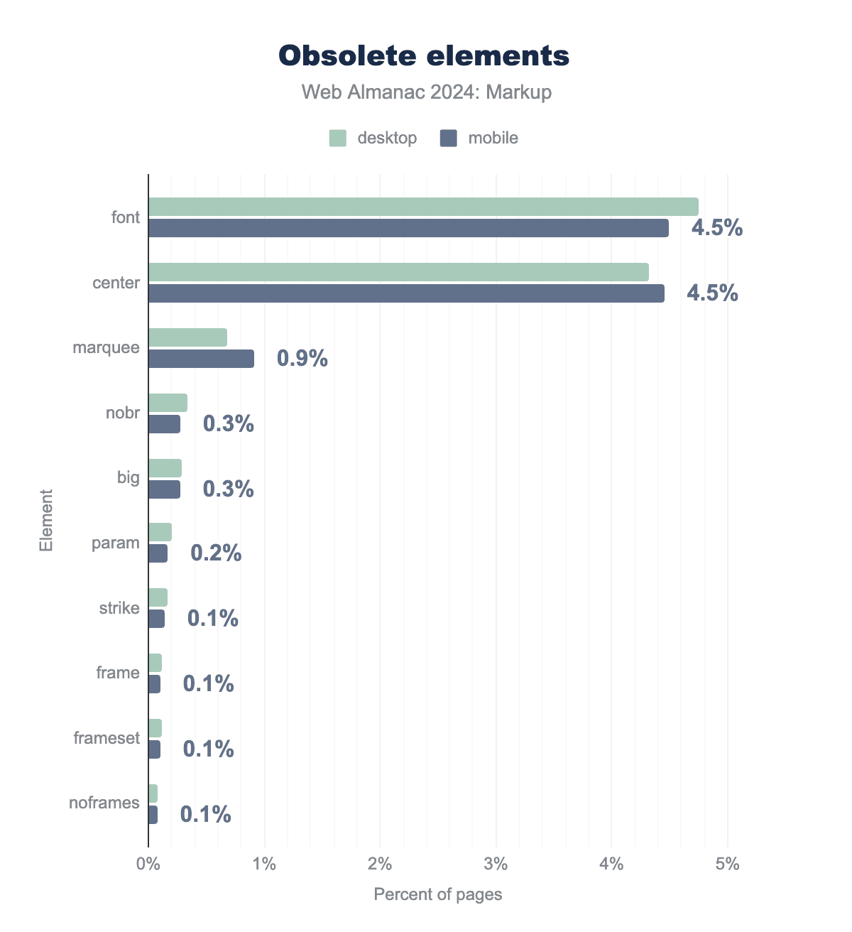 If we compare these results to the 2022 ones, we see a slow but steady decline in their usage. One notable improvement is the drop in the use of the <center> element, which has fallen from 6.1% in mobile sites last year to 4.5% this year. This marks a significant decrease and has led to <center> being surpassed by the <font> element as the most commonly used obsolete tag, now present on 4.5% of mobile pages. Interestingly, despite this positive trend, some high-profile sites, like Google’s home page, still rely on the <center> element in their markup.