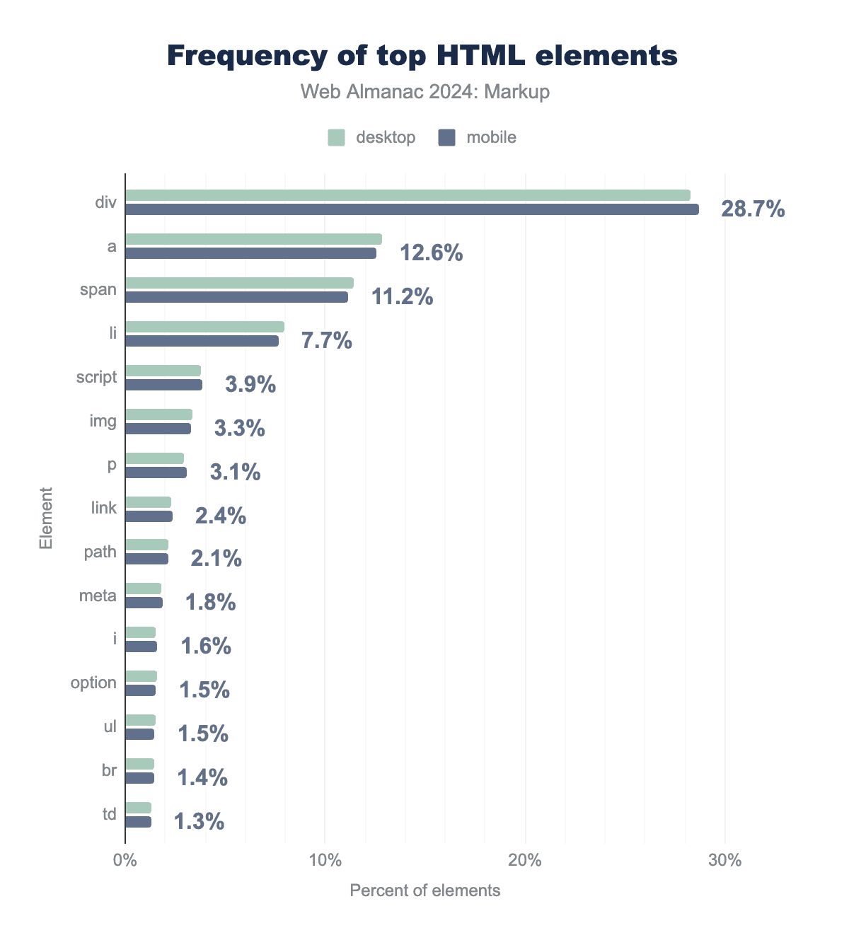 In this section, we’ll explore HTML elements—what elements are commonly used, how often they appear, and which ones you’re likely to find on a typical page. We’ll also look into custom and outdated elements. And just to clarify: is “divitis” still around? Yes, it is.