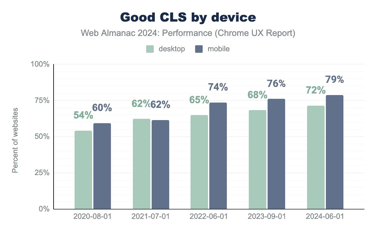 In 2024, 72% of websites achieved good CLS scores, while 11% had poor ones. We can also see that websites on mobile devices provide a better user experience when it comes to site stability than desktop sites.