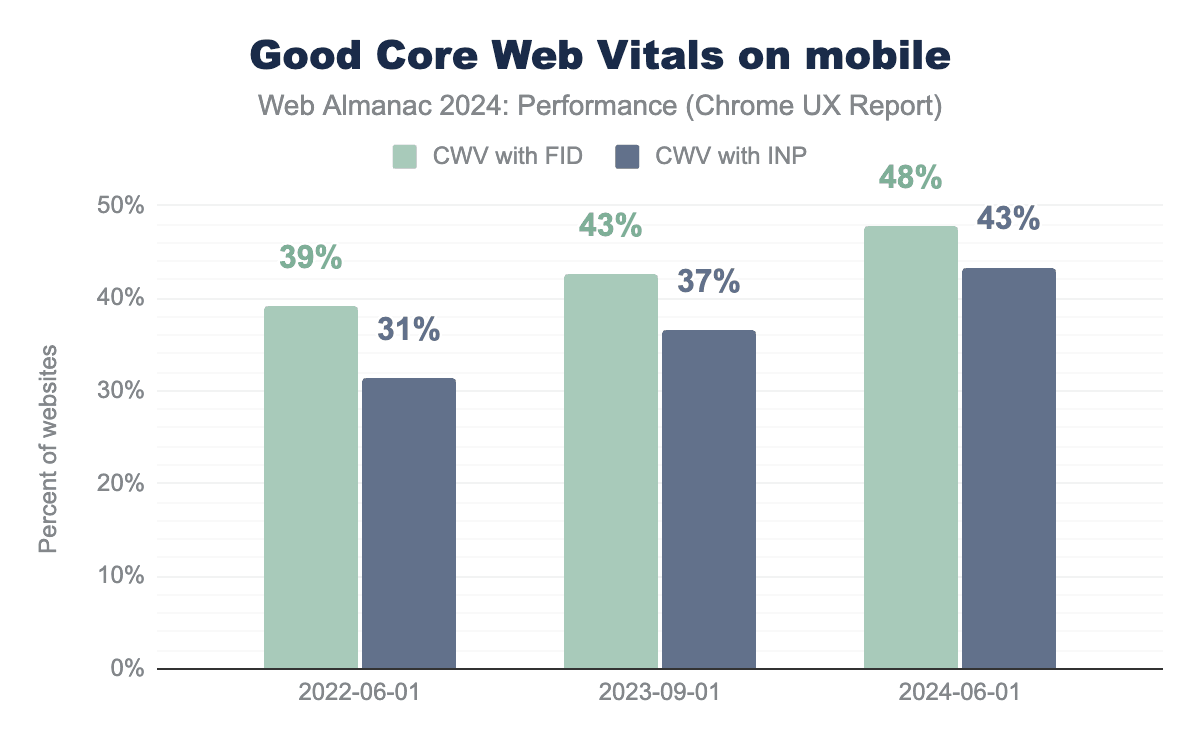 In the period from 2020 to 2022, we saw that mobile web performance measured by CWV with FID was improving faster than desktop one, and the gap between them was closing, reaching just 5% in 2022. As CWV with INP chart shows, in 2024, the websites on the desktop performed 11% better than on mobile, so the introduction of the INP shows that the gap is much bigger.