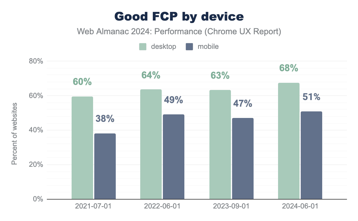 FCP has shown improvements over the past few years. Although there was a slight decline in 2023, the metric recovered in 2024, reaching 68% for desktop and 51% for mobile websites. Overall, this reflects a positive trend in how fast the first content is loaded. Taking into account that the TTFB metric remained mostly unchanged, FCP improvements might be driven by client-side rendering rather than server-side optimizations.