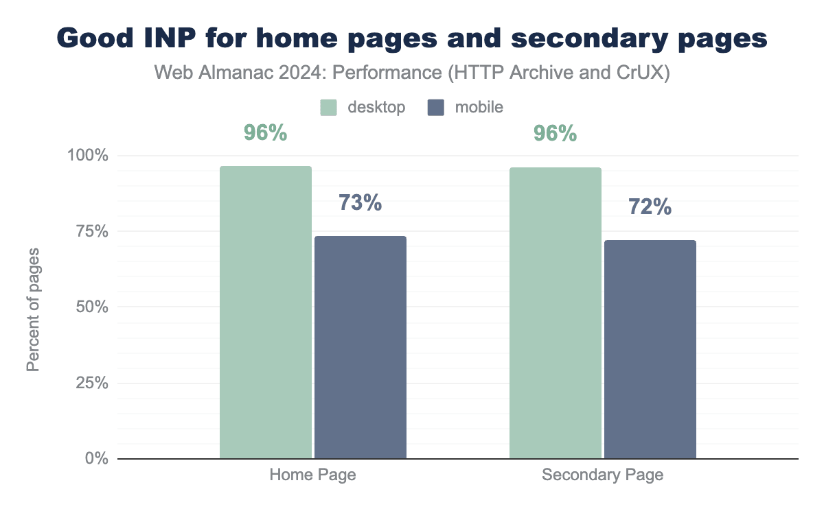 • Despite the improvement in INP each year, a significant gap between desktop (97% good INP) and mobile (74% good INP) performance still exists.
