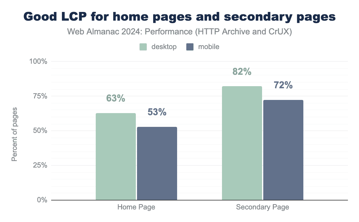 The comparison between home pages and secondary pages reveals an interesting trend: 72% of all secondary pages have good LCP, which is 20% higher than the result for home pages. This is likely because users typically navigate on the home page first, causing the initial load to happen on the home page. After they navigate to secondary pages, many of the resources are already loaded and cached, speeding up the LCP element to render. Another possible reason is that the home page often contains more media-rich content such as video and images, compared to secondary pages.