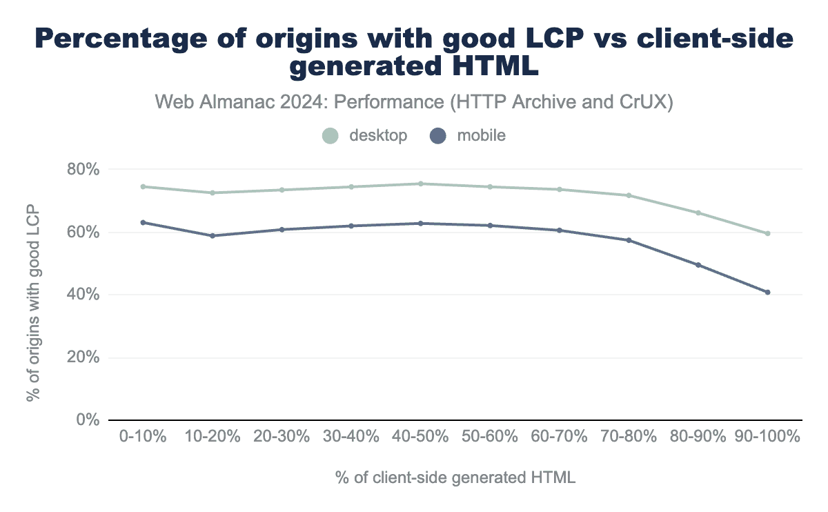 The chart below illustrates the distribution of client-side generated content. It compares the initial HTML with the final HTML (after JavaScript runs) and measures the difference. It displays how the percentage of websites with good LCP changes as the percentage of client-side generated content increases.