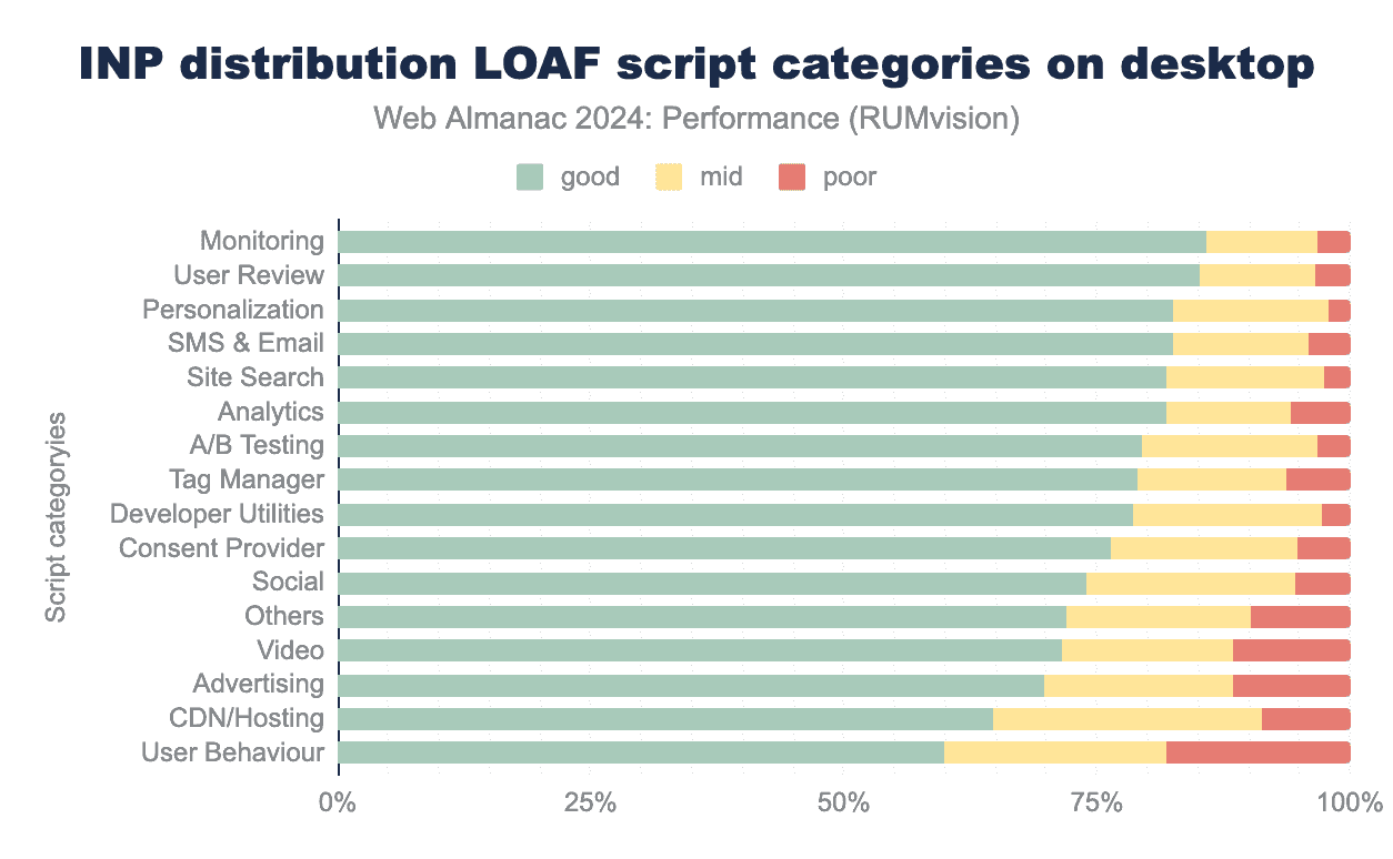 It is worth noting that the monitoring category, which also includes performance monitoring tools, has one of the least impacts on poor INP results. This is a good argument in favor of using web performance monitoring tools, as they help with valuable web performance insights without significantly affecting interactivity performance.