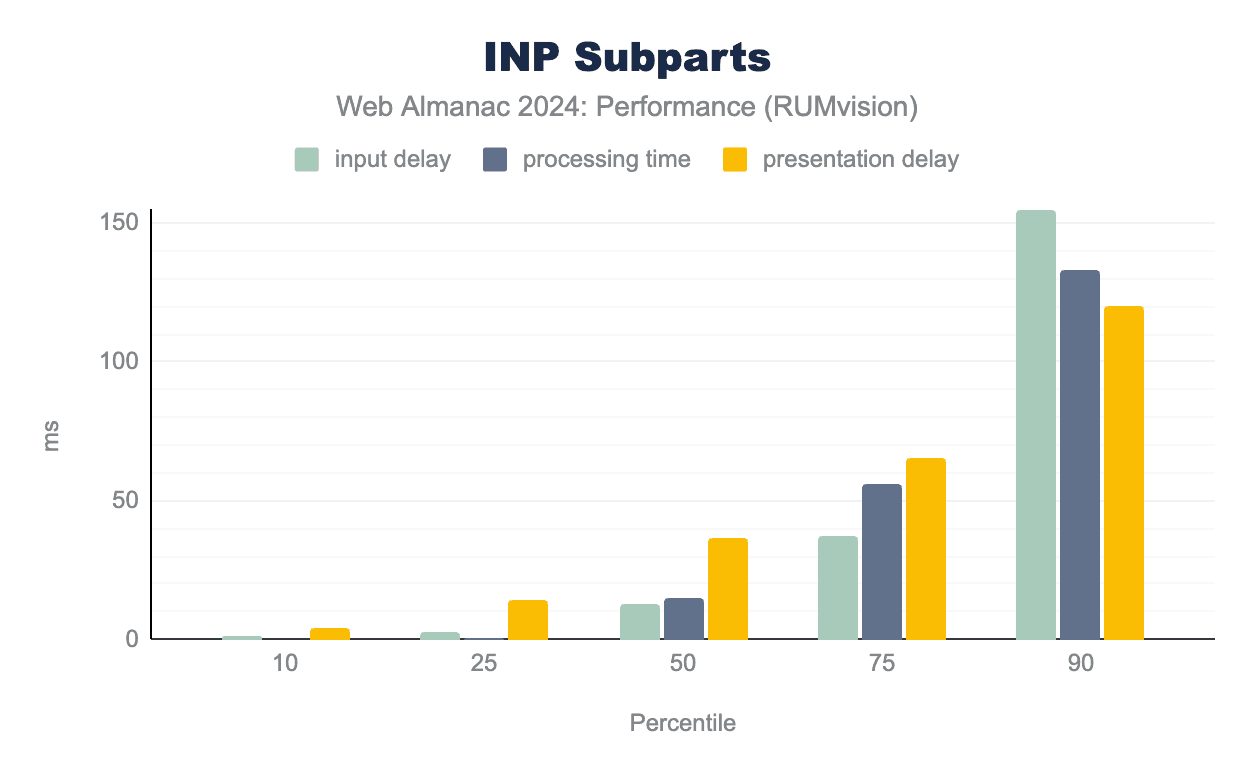 • INP can be divided into three sub-parts: Input Delay, Processing Time, and Presentation Delay. Presentation Delay has the biggest share of the median INP in RUMvisions’s data.