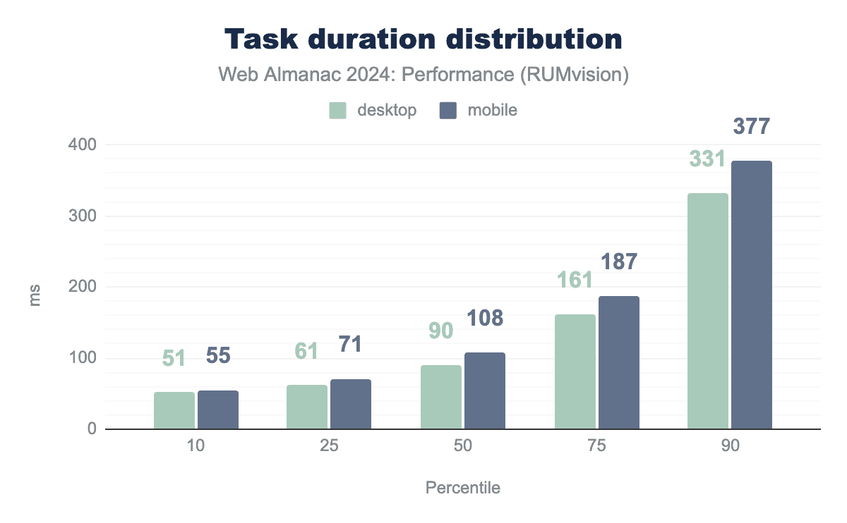 The task duration distribution shows a median task duration of 90 milliseconds for desktop and 108 milliseconds for mobile, which is twice more than the best practice recommendation of under 50 milliseconds. Less than 25% of websites have an optimal task duration below 50 milliseconds. We can also see that in every percentile, task duration on mobile sites is longer than on desktop sites, with the gap increasing as the percentile increases. On the 90th percentile, there is a 46 millisecond difference between the average task duration between device types. This correlates well with INP scores that show better results on desktop compared to mobile.