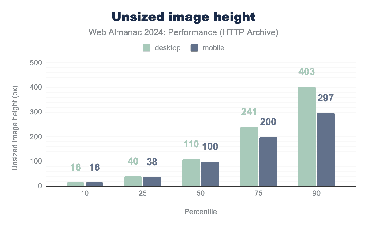 The median mobile site has unsized images of about 100 pixels in height. Our test devices have a mobile viewport height of 512 pixels, representing almost 20% of the screen width. This can potentially be shifted down when an unsized (full-width) image loads, which is not an insignificant shift.