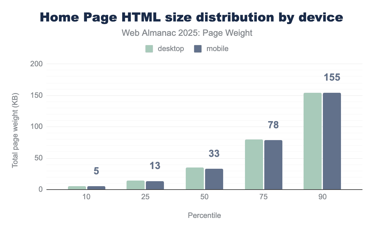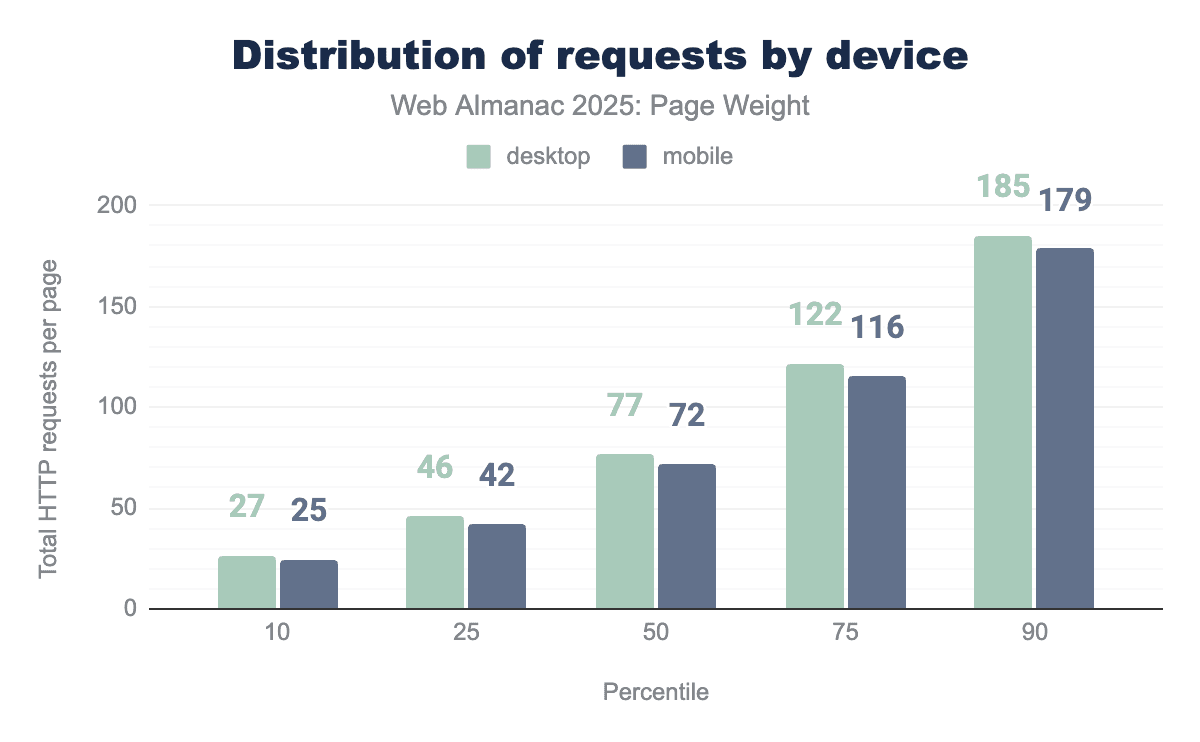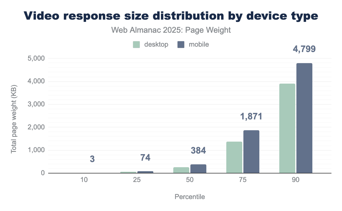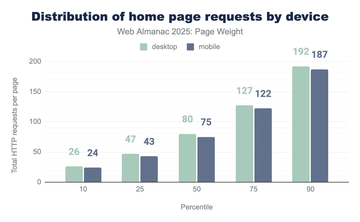 Year over year, the median home page size grew 7.8% to 2.7 MB. The median mobile home page is 2.6 MB, growing 8.4% from 2.4 MB in 2024. In 2025, the median desktop page size reached 2.9 MB, up 7.3% from 2024’s median of 2.7 MB.