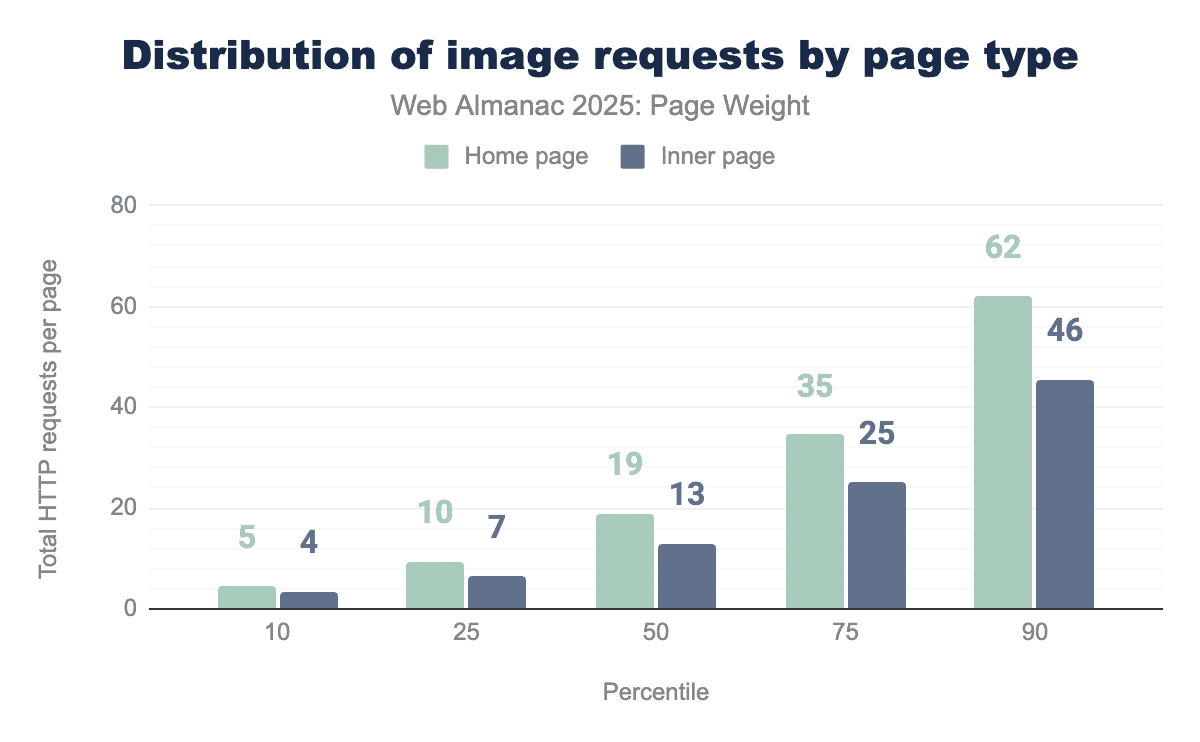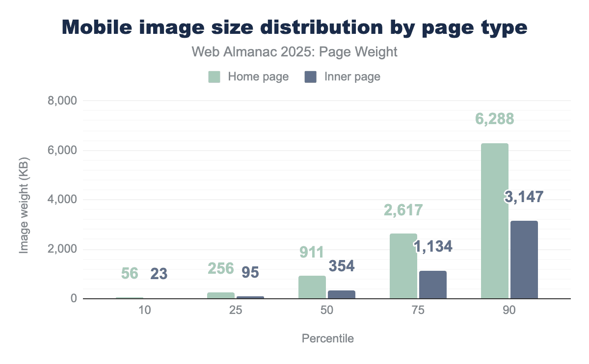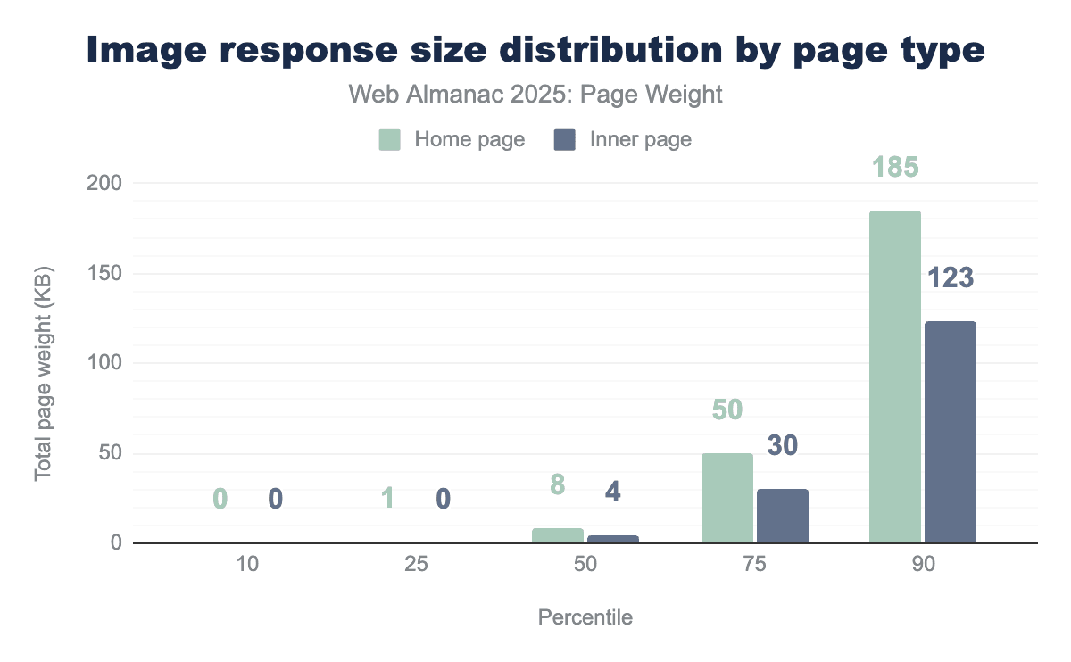 Inner pages had smaller individual image file sizes than home pages with a median size of 4 KB. At the 90th percentile, home page images were 185 KB while inner images were 123 KB.