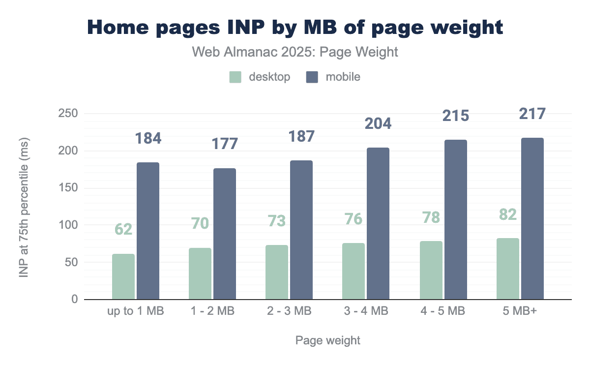 Desktop home pages consistently achieved INP times below the 200ms threshold across all weight categories even in the heaviest range, at 5 MB+, INP for the 75th percentile was just 82ms. Mobile home pages up to 3 MB achieved their INP goal. However, those in the 3-4 MB range, INP at the 75th percentile exceeded 200ms.
