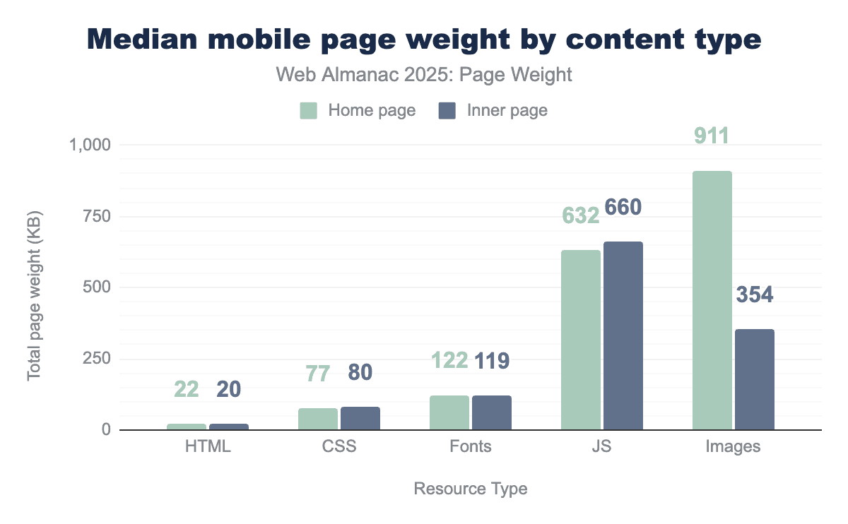 The median home page in 2025 was 2.86 MB on desktop and 2.56 MB on mobile. Images accounted for the most bytes on both mobile and desktop, followed by JavaScript and fonts.