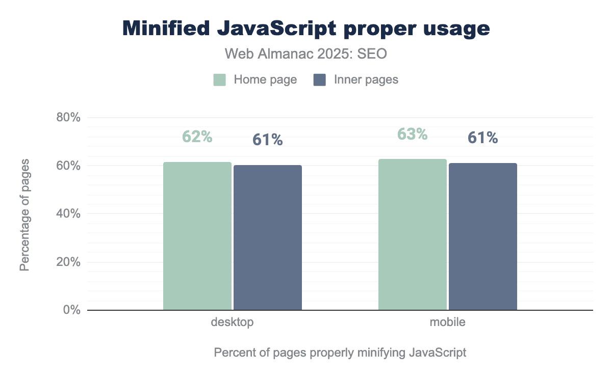 In 2025, 62% of desktop and 63% of mobile home page loads passed Lighthouse’s Minify JavaScript test.
