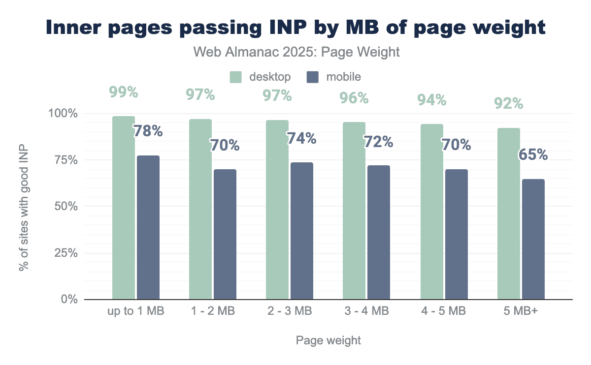Inner pages show a similar gap between mobile and desktop. 99% of pages up to 1 MB achieved a sub-200ms INP compared to only 78% of mobile pages in the same weight range. At 5 MB+, 92% of desktop inner pages passed the interactivity assessment, while 65% of mobile pages achieved the goal.
