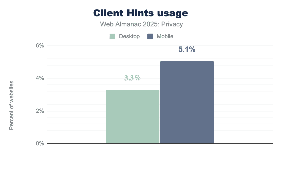 User-Agent Client Hints offer a privacy-conscious alternative to the traditional User-Agent string, allowing browsers to share device and browser information only when explicitly requested by servers. Instead of exposing a detailed fingerprint by default, sites must opt in to specific hints, reducing passive data leakage. In 2025, adoption sits at 3.3% for desktop and 5.1% for mobile, with mobile’s higher rate likely reflecting greater need for responsive design signals. This transition is now permanent; with Chrome 145 removing the UserAgentReduction policy, sites must migrate to User-Agent Client Hints for detailed browser or device information.