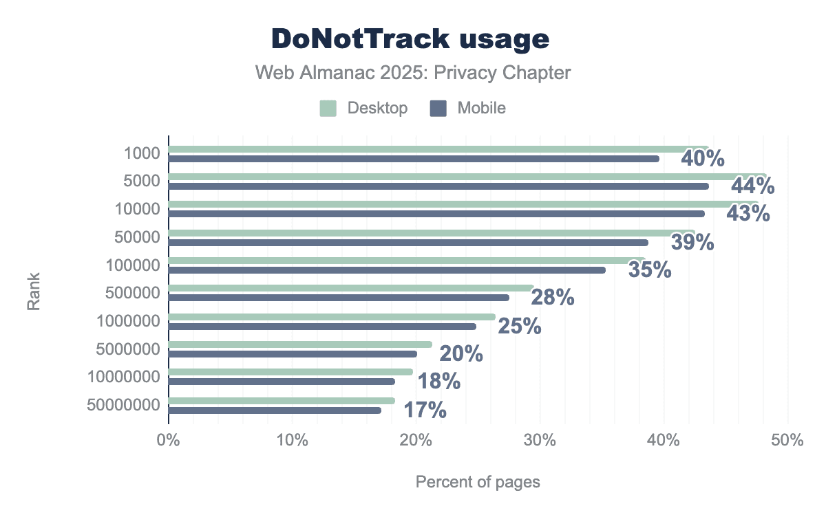 Mobile adoption consistently edges out desktop across all ranking tiers, though the gap is narrow. The steepest drop-off occurs between the top 100,000 sites (35%) and the 500,000 tier (27%), indicating that mid-tier and smaller sites are far less likely to check for DNT. Whether these sites actually honor the signal, rather than simply detecting it, remains an open question, as DNT compliance has never been enforceable.